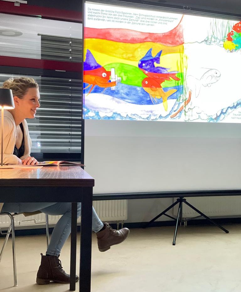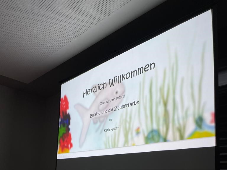 Sobald man den Raum betreten hat, der in leicht schummriges Licht getaucht war, empfing einen schon ein zarter Duft nach Orangen und ein leises Gemurmel von Unterwassergeräuschen. Alle Sinne sollten heute angesprochen werden, um die Zuhörer*innen mit in die zauberhafte Welt von Bulajbu zu entführen. Groß war vorne an der Leinwand die Auftaktfolie für die Buchvorstellung zu sehen und die Kinder haben sich schnell ein Plätzchen mit ihrem Sitzkissen auf dem Boden gesucht. Die neugierigen Erwachsenen durften in der hinteren Reihe Platz nehmen.